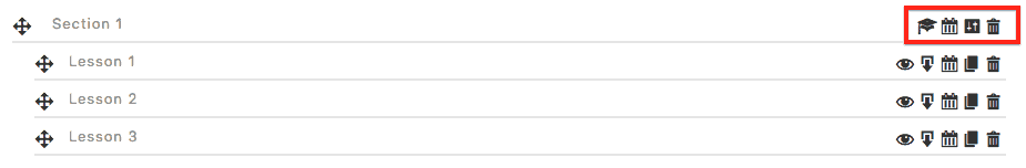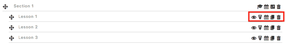 In each lesson, you can click the eye icon to edit the lesson content. The arrow icon right next to it allows you to add downloadable files to your lesson. To add timed delivery, click the calendar icon next. And the icon next to it will allow you to copy the lesson content. The last icon, the trash can, allows you to delete a lesson.