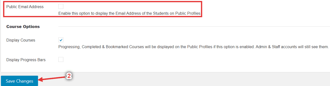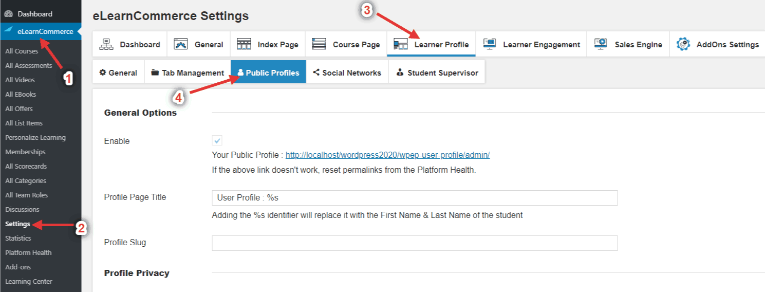 1.: Go to 1.:eLearnCommerce click on 2.:Settings then click 3.: Learner Profile then 4.: Public Profiles